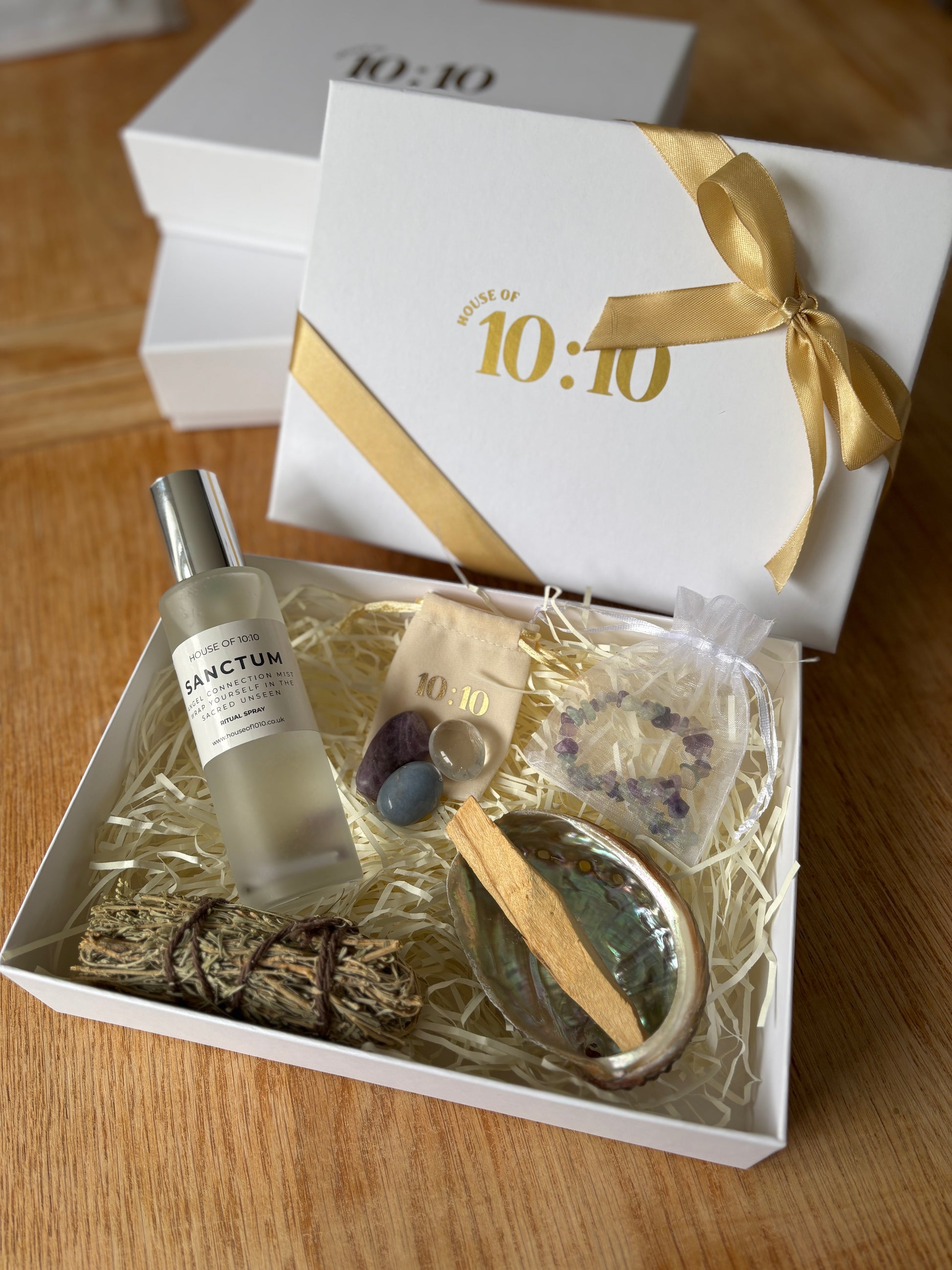 - 3 Crystals chosen to match your intentions, wrapped in a branded velvet pouch