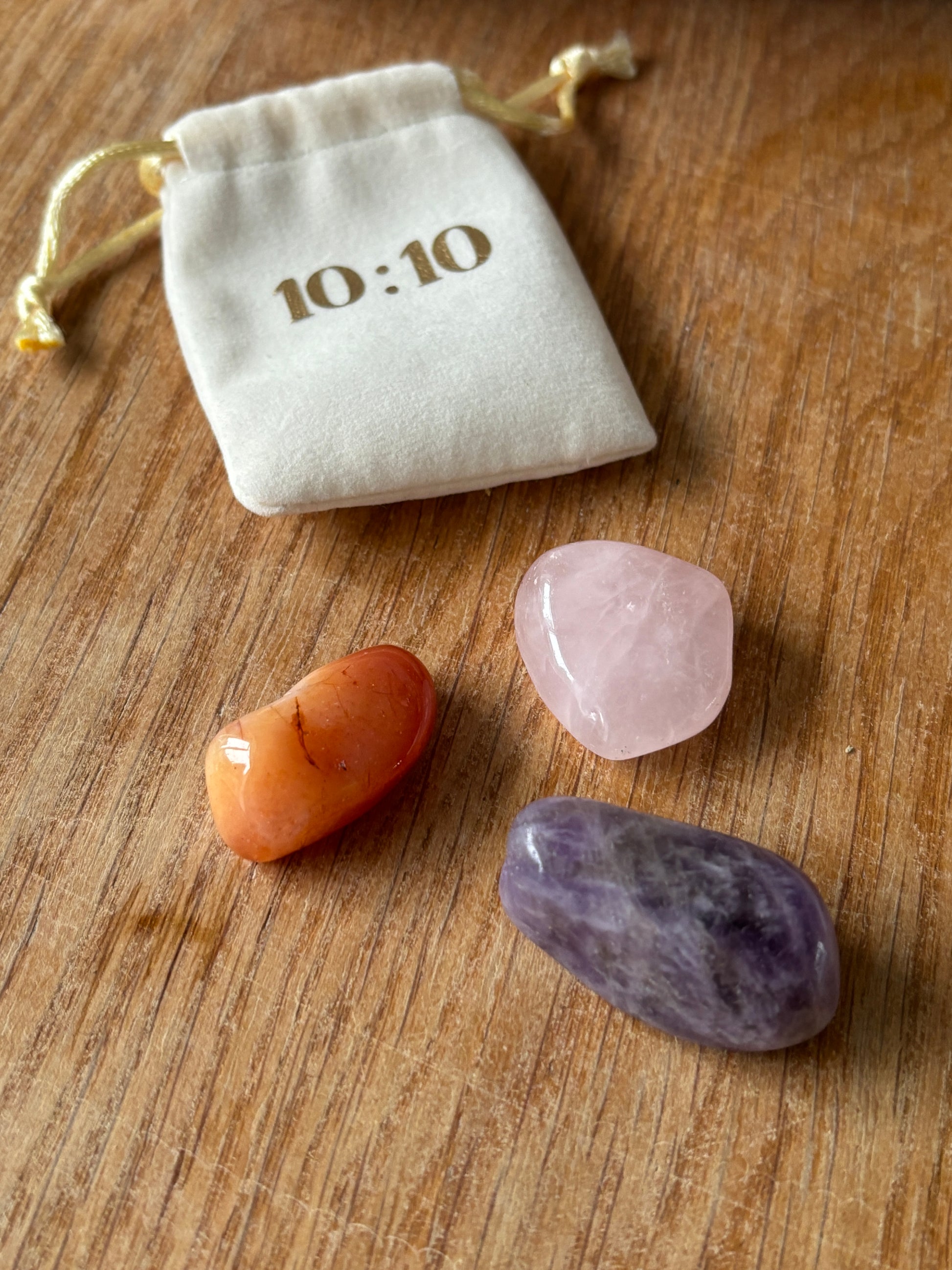 - 3 Crystals chosen to match your intentions, wrapped in a branded velvet pouch
