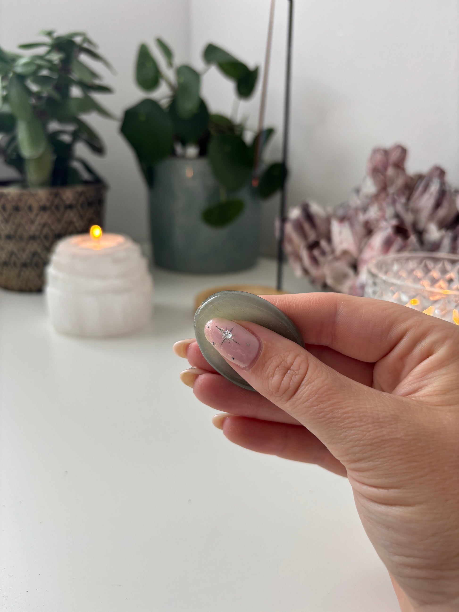A stone to hold when doubt whispers. Smooth and cool, Green Aventurine reminds you of prosperity, possibility, and the magnetic nature of your own energy. Perfect for manifestation rituals or whenever you need to believe again.